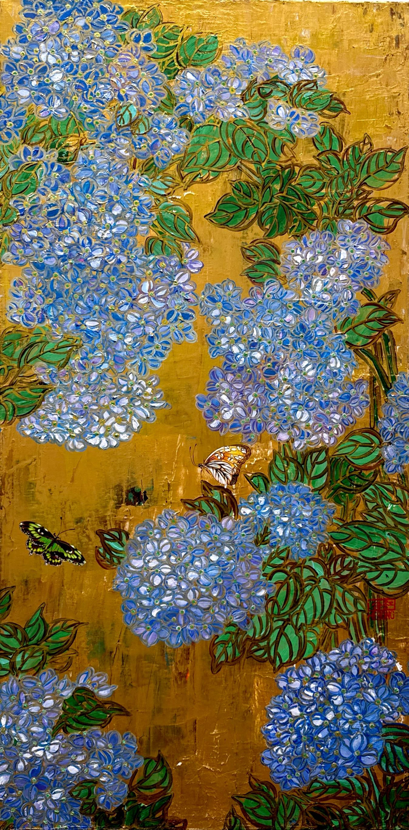 Verdant Greens and Crimson Blossoms with Butterflies