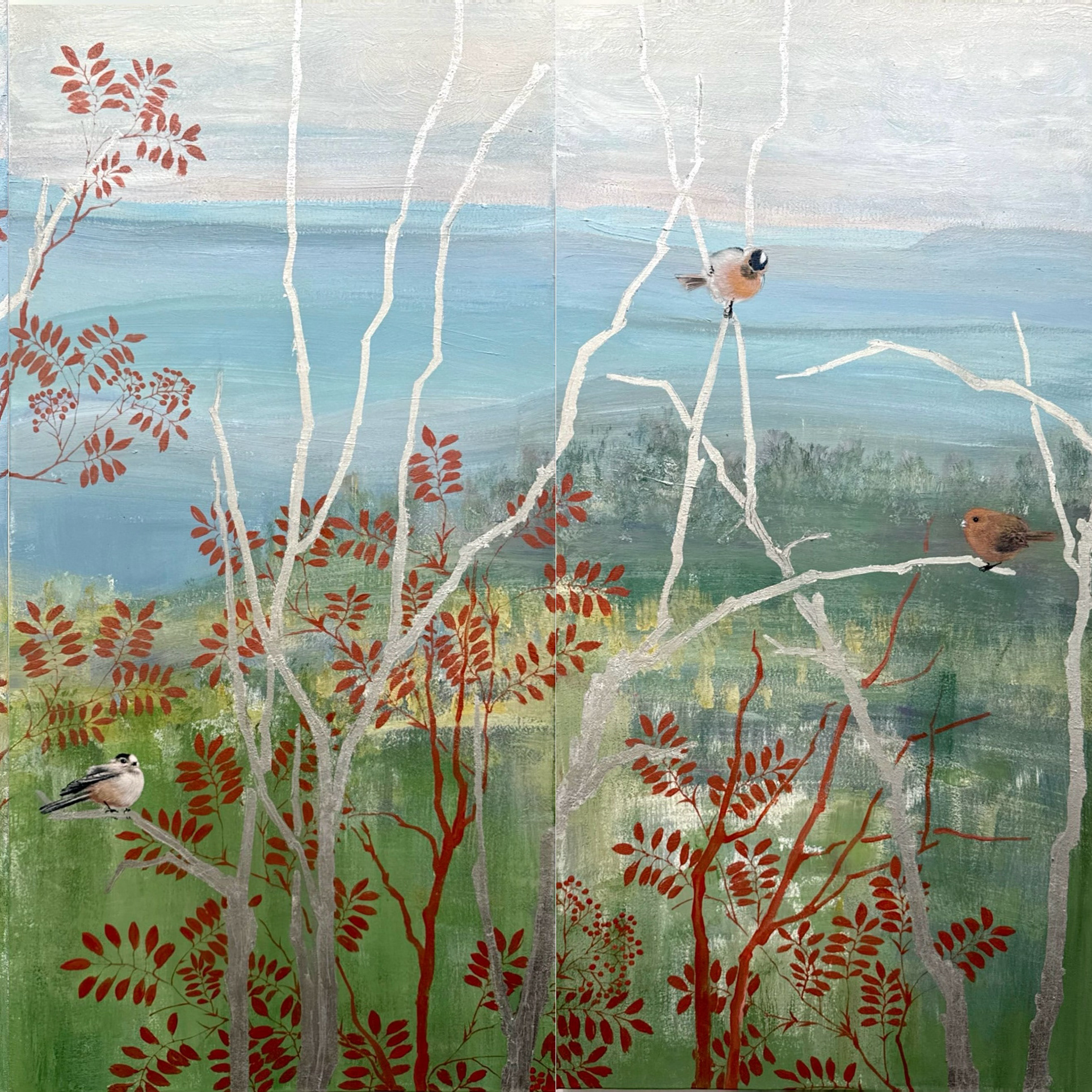 Dew on Maple, Sparrows at Rest; Light Clouds over Dista